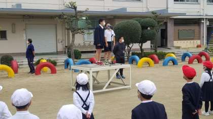本日、運動場で児童朝会を行いました。保健委員会と図書委員会よりお話がありました。担当の先生からは登校時の安全についてお話がありました。しっかりと話を聞くことができていました。