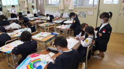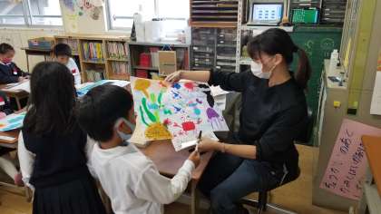 1年生の図工の様子です。できた作品を先生にみてもらっていました。