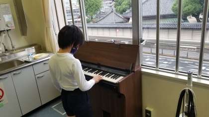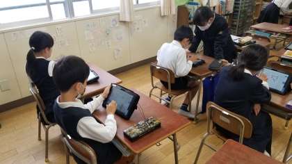 タブレットで「やるKey」に挑戦している児童や電子ピアノを弾いている児童などの様子です。