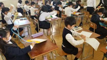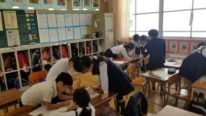 写真中:2年1組の様子です。明日の図書館見学の準備をしていました。