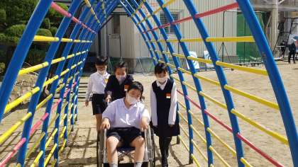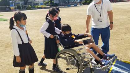 後半は班ごとに、運動場や廊下を回りました。車いすに乗っている人の気持ちを考え、安全に操作することを体験できました。