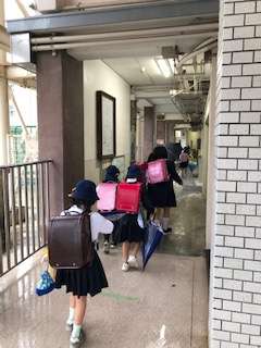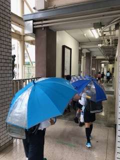 あいにくの雨で、傘の花が開いた登校風景になりました。