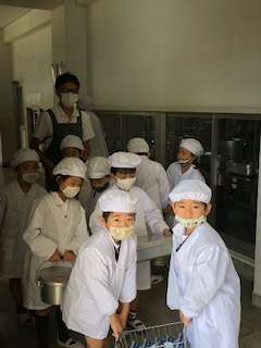 今日の給食は、まぐろのオーロラ煮、ベーコンとじゃがいものスープ、きゅうりとコーンのゆずドレッシング、パン、牛乳、です。いただきます。