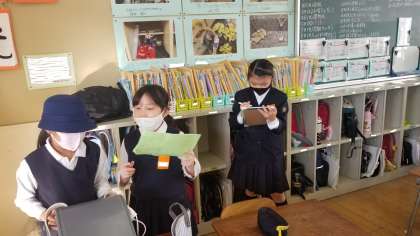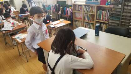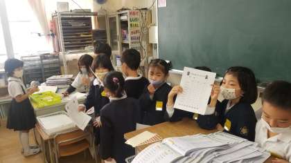 写真中:2年生の様子です。九九を覚えて先生に聞いてもらっていました。