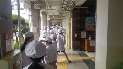 今日の給食は、和風ハンバーグ、みそ汁、かぼちゃのいとこ煮、ごはん、牛乳です。いただきます。