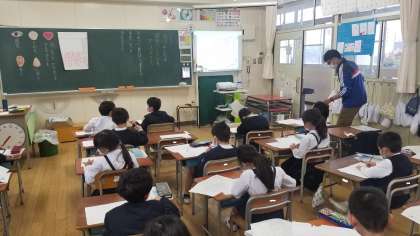写真上:1年生の国語の様子です。「気づいたことを文しょうにかこう。」です。いつ、どこで、何を見て、気づいたこと、思ったことというように、文しょうの書き方の形を確認しながら書いていました。
