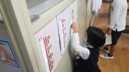 写真下:2年生の算数です。九九のテストで合格するとシールがもらえます。皆とてもうれしそうでした。