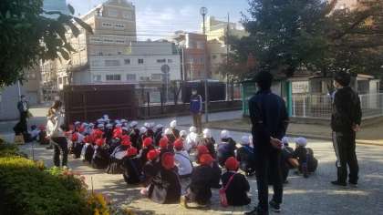 1年生が、「公園たんけん」に出発しました。今日は、担任の先生、なかよしの先生、学生ボランティアの先生が付き添いで、校区の公園で活動します。