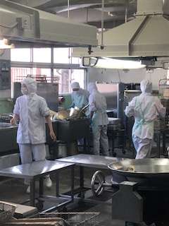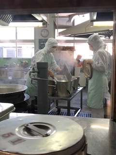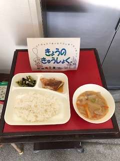 今日の献立は、赤魚のしょうゆだれかけ、みそ汁、小松菜の炒め物、ご飯、牛乳です。