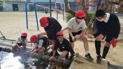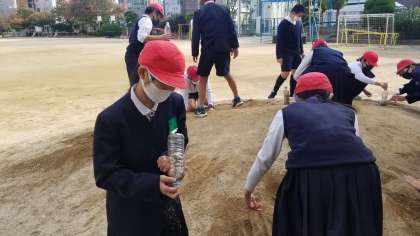 写真上:6年1組の理科の様子です。土地のつくりや変化について学習します。身近な観察や実験から興味関心をもたせ、土地のつくりや変化について理解を深めます。