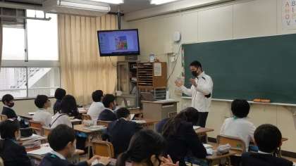 写真下:6年2組の英語の様子です。英語という教科の特性についてお話がありました。中学校に進学しても自信をもって英語に取り組んでもらいたいと思います。