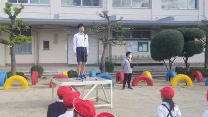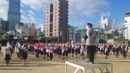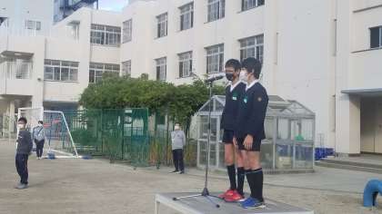 本日、運動場で児童朝会を行いました。