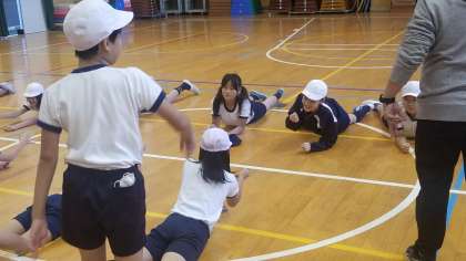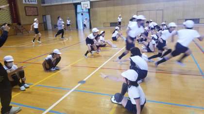 6年生の体育の様子です。いろいろな体勢からじゃんけんをして追いかけっこをして体をほぐしていました。