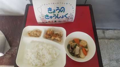 今日の給食は、あげどりのねぎだれかけ、含め煮、もやしのピリ辛あえ、ごはん、牛乳です。いただきます。