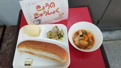 今日の給食は、豚肉のカレー風味焼き、ケチャップ煮、りんご、パン、牛乳です。いただきます。