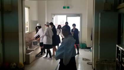 写真上:授業が終わり、給食の準備をする6年生の様子です。