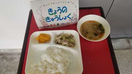 今日の給食は、豚肉とまいたけのいためもの、つみれ汁、かぼちゃういろう、ごはん、牛乳です。いただきます。
