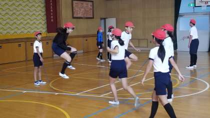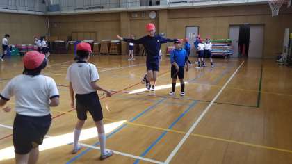 6年1組の体育の様子です。体つくり運動の体力を高める運動です。跳び方や人数など、条件を変えて長縄跳びに取り組んでいました。
