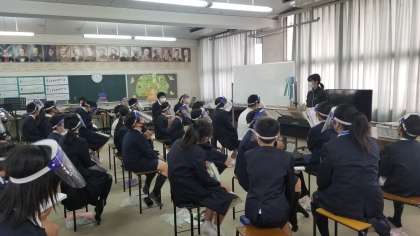写真上:6年生の音楽の様子です。のびやかな声を出す練習をしていました。