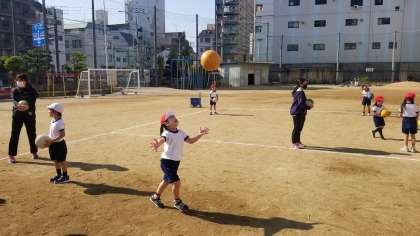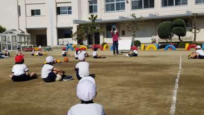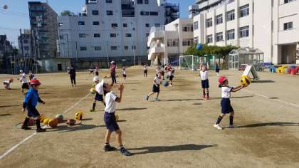 1年生の体育の様子です。多様な動きをつくる運動遊びの様子です。ボールを投げて受ける運動でも、回って受けたり、手をたたいてうけたりと工夫して、動きのレパートリーを増やしていました。