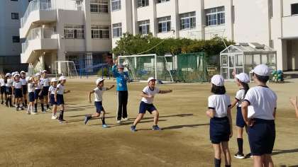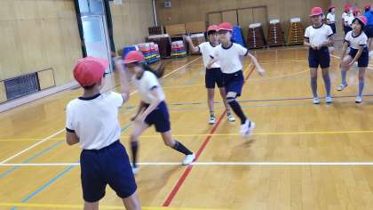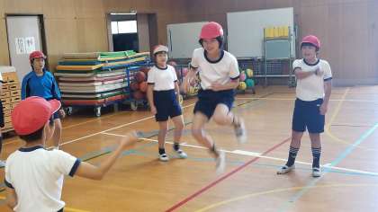 4年生の体育の様子です。1組は体育館で、2組は運動場で活動していました。多様な動きをつくる運動の用具を操作する運動です。縄を跳ぶ運動では、跳び方や回し方、縄の長さなどを工夫していました。「いま。」とか「その調子。」など互いに声をかけあっていました。