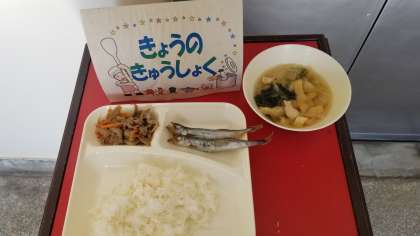 今日の給食は、焼きししゃも、五目汁、きんぴらごぼう、ごはん、牛乳です。いただきます。