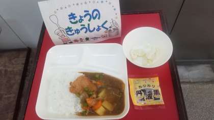 今日の給食は、カツカレーライス、カリフラワーのピクルス、いり黒豆、牛乳です。いただきます。