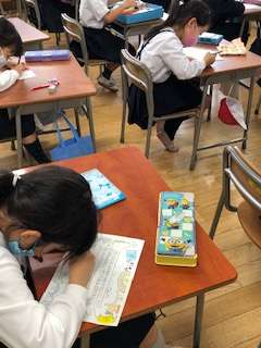 下段は、2年生の生活科の学習です。先日の町たんけんでお世話になった方にお礼状を書いていました。