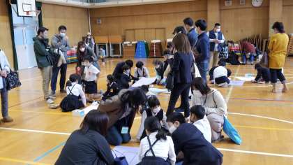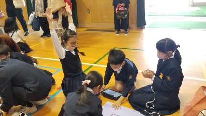 体育館でプログラミングの学習です。プログラムを作り、考えた通りロボットを動かします。できた時はとてもうれしいです。