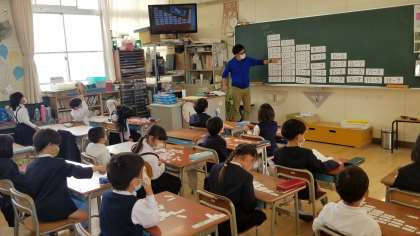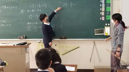 写真上:4年2組の算数の様子です。分数の計算の考え方を発表しあっていました。