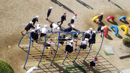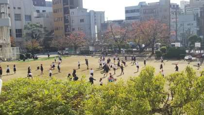 たくさんの児童が運動場で遊んでいます。運動場も喜んでいると思います。