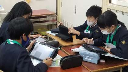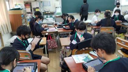 と、タブレットを活用して、英語で大阪市の紹介文をグループで作ります。