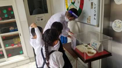 授業が終り手洗いに来た1年生が、サンプルをのぞきにきていました。「おいしそう」と栄養教諭の先生とお話していました。