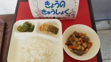 今日の給食は、さごしのおろしじょうゆかけ、大豆と冬野菜の煮もの、きゅうりのしょうがづけ、ごはん、牛乳です。いただきます。