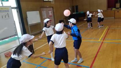 本日6時間目、4年2組で体育の授業研究を行いました。体つくり運動の用具を操作する運動です。