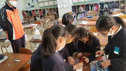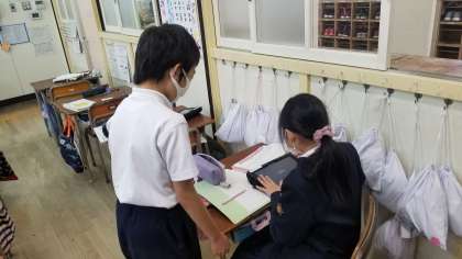 教室の様子です。お友だちと楽しく遊んでいます。英語の発表を考えている児童もいました。
