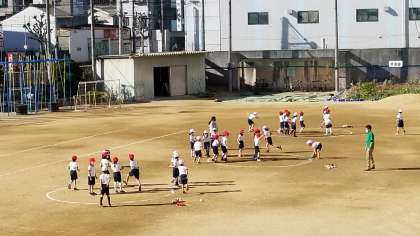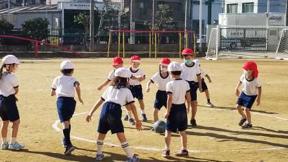 1年2組の体育の様子です。ボールゲームをしています。チームで作戦を考えて、円の中の児童にボールを転がして当てるゲームです。楽しく活動できていました。
