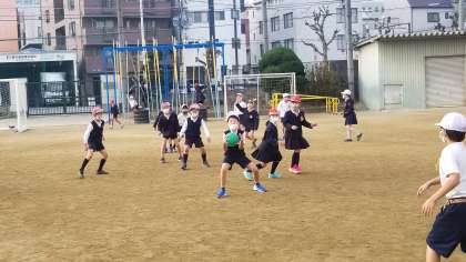 運動場ではサッカーやドッジボール等たくさんの子どもたちが遊んでいます。