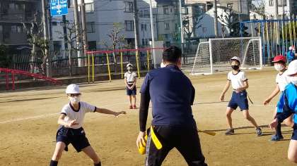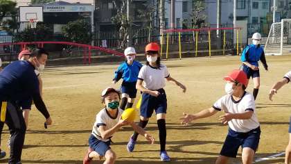 5年2組の様子です。ボール運動でタグラグビーをしています。先生も参加していました。