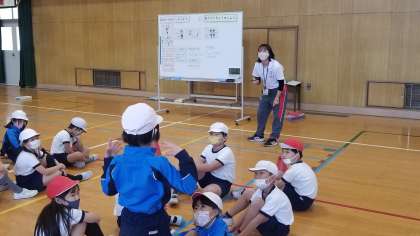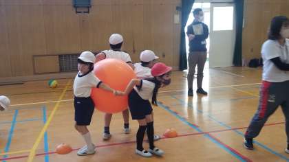 2年2組の体育の授業です。体つくり運動の用具を操作する運動です。子どもたちから「もっとやりたい」という声が授業の中ででていました。みんな積極的に取り組むことができていました。