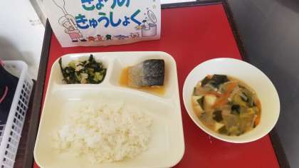 今日の給食は、さばのみぞれかけ、みそ汁、こまつなの煮びたし、ごはん、牛乳です。いただきます。