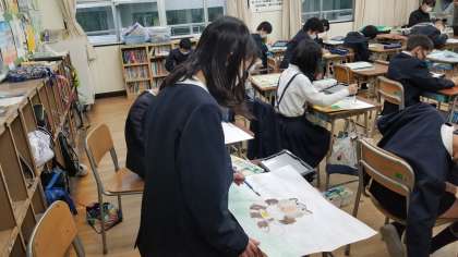 写真上:6年2組の図工の様子です。今まで読んだ本の中から、心に残っている作品の場面を描いています。完成した児童は、「本の名前」「そのシーンを選んだ理由」を作品シートに書いていました。