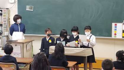 写真下:2年生の様子です。「町たんけん」の発表を1・2組合同でしていました。お店の人から聞いたことなどを写真を活用しながら発表できていました。