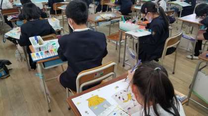 写真上:4年2組の図工の様子です。国語の教材「ごんぎつね」を題材に描いています。物語のイメージを作品に表すことができているでしょうか。完成がとても楽しみです。