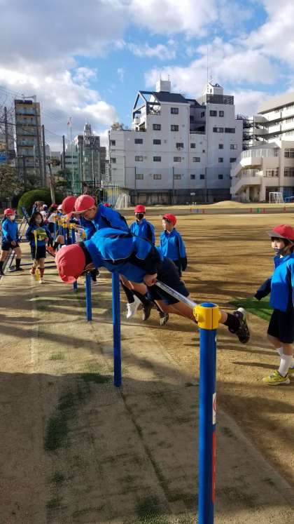 写真下:3年1組の体育の様子です。小型ハードル走のあと、鉄棒運動に取り組みました。「先生見て。」と逆上がりを見せてくれました。