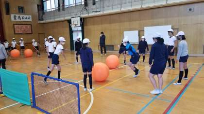 6年2組の体育の様子です。大きなボールを使って、ウオーミングアップをしていました。