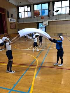 下段は、3年生の体育、体つくり運動の一環で、タオルを巧みに使ってボールを飛ばしたり受け止めたりしていました。