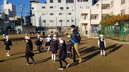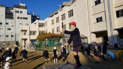 児童朝会を待つ1年生や準備をする放送委員の様子です。