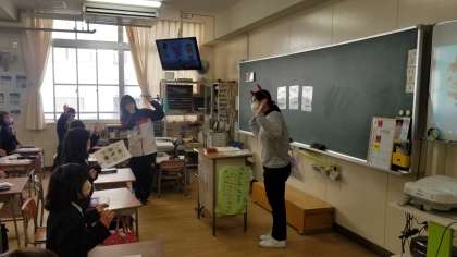 2年2組の英語の様子です。クリスマスに関係する英語の活動でした。C-NETの先生もトナカイの被り物をして雰囲気作りをしてくれました。