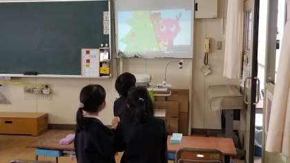 子どもたちは、授業の後もレッスンビデオを見て楽しんでいました。